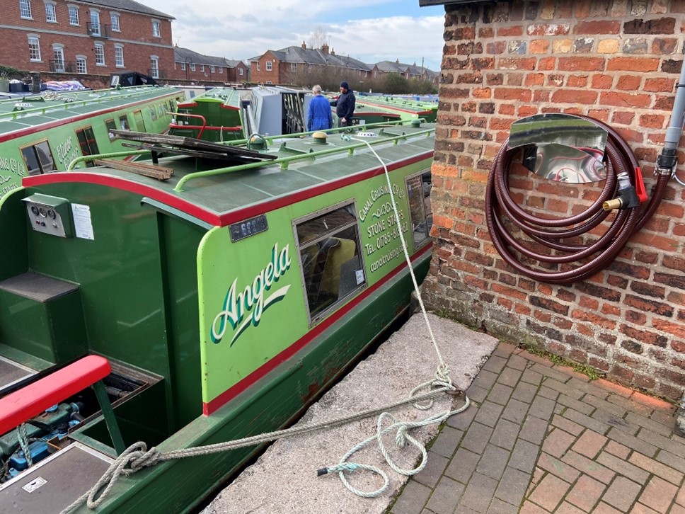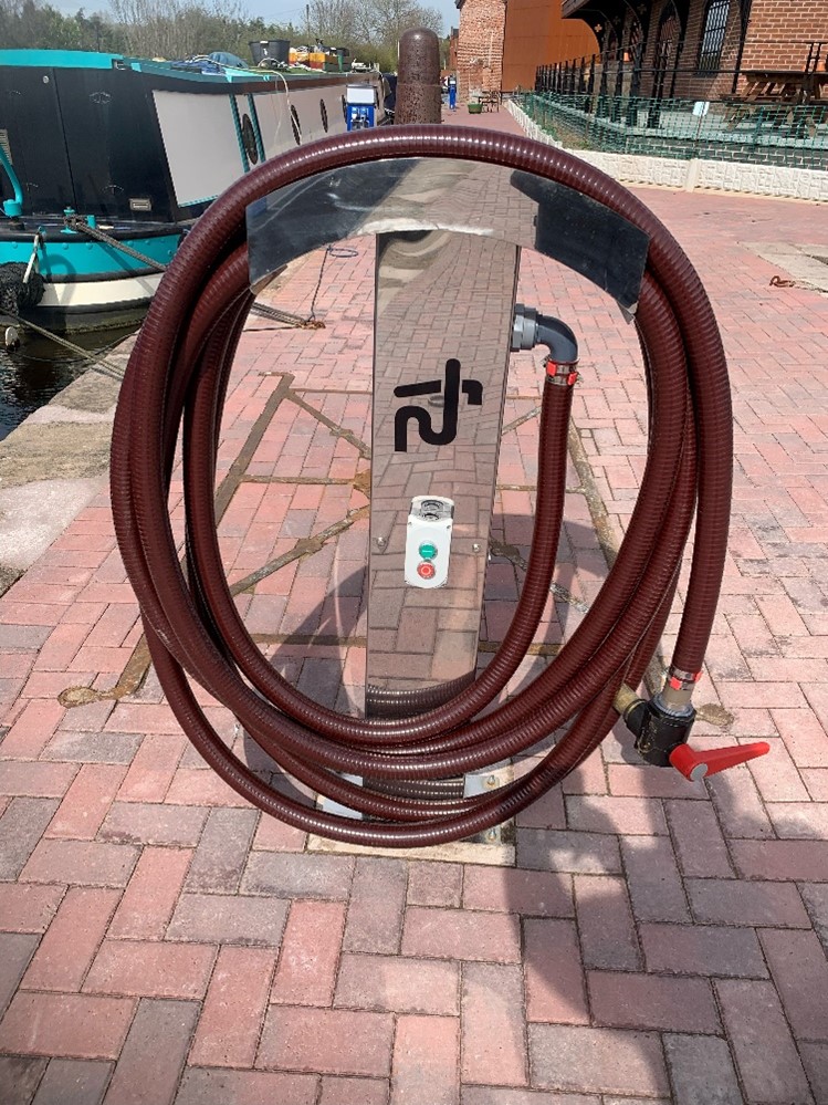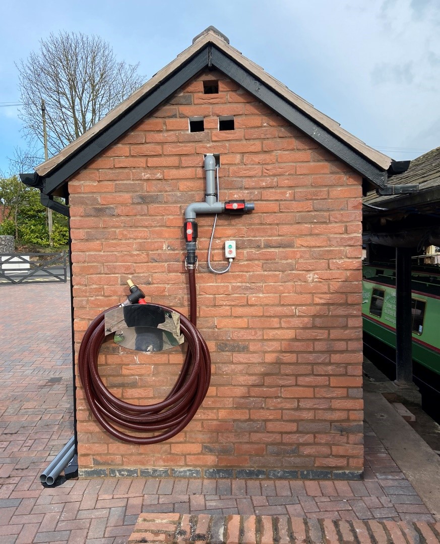 Three Pump Out connection points have been installed. Wall mounted connection installed on the side of the pump house, one on the wall of the Drydock and one (freestanding) on the canal side which all include 15 metre run for ease of use by boatyard residents or passing craft.